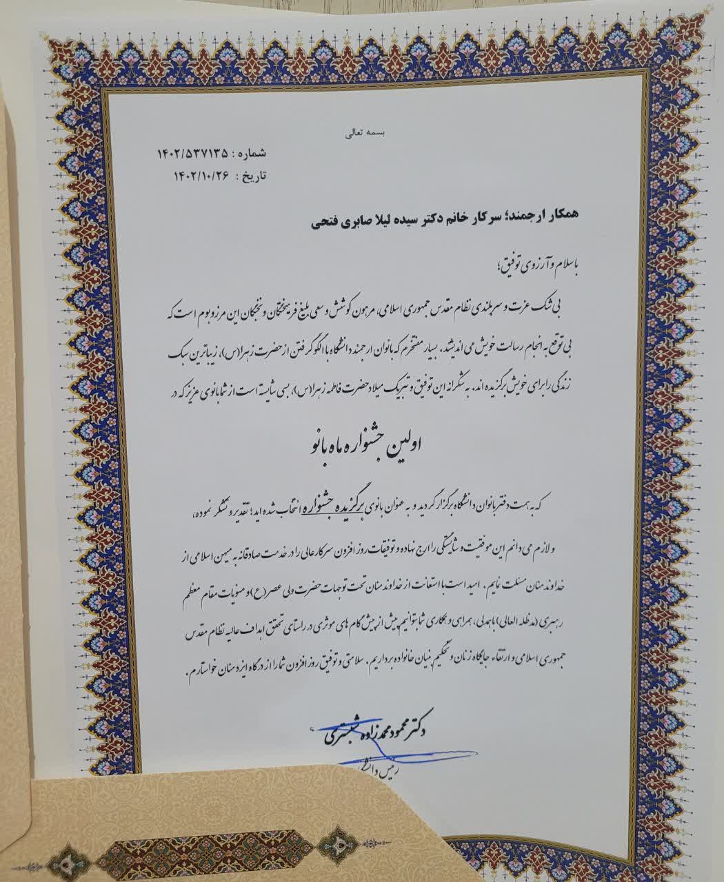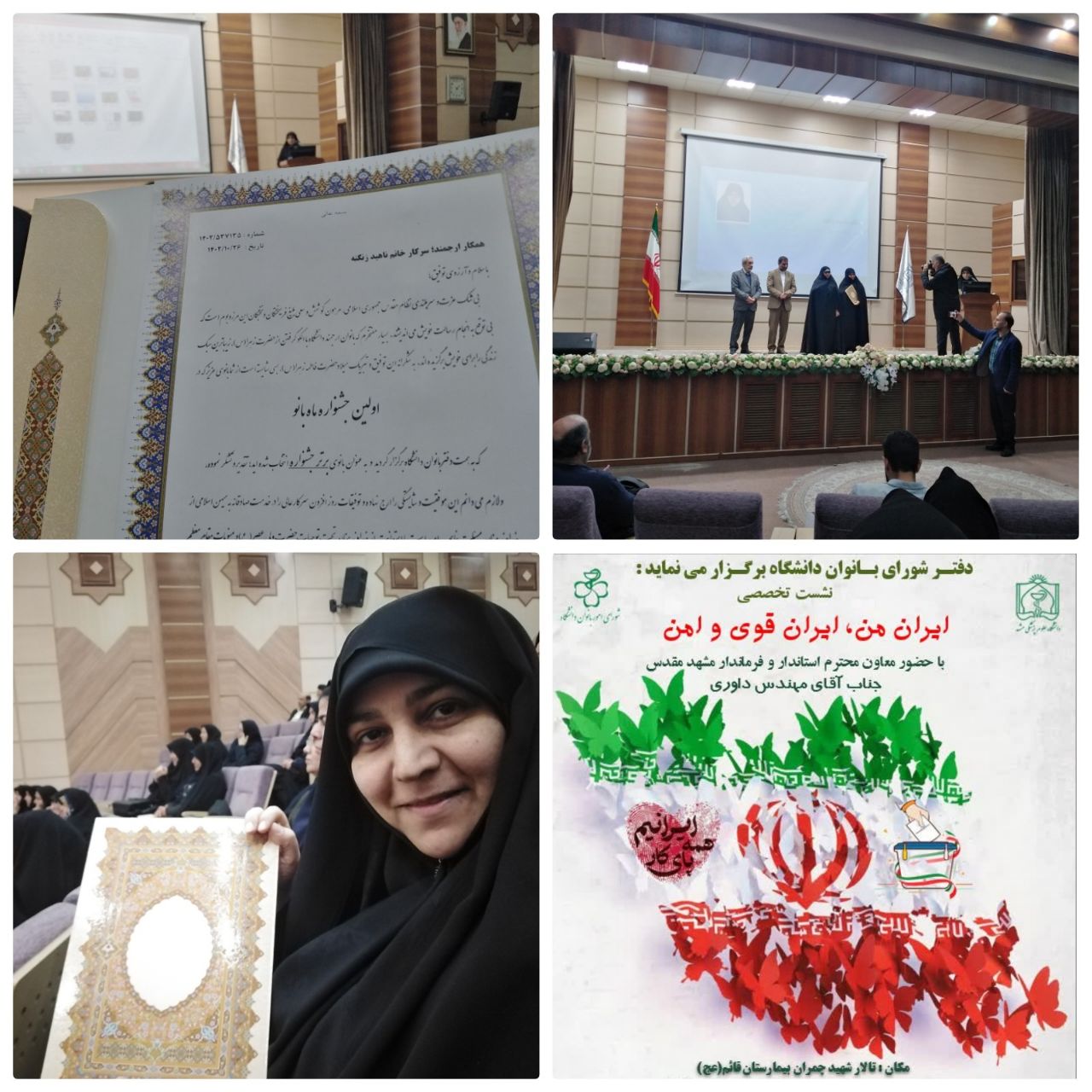انتخاب شایسته شما عزیزان را به عنوان بانوی برتر دانشگاه در اولین جشنواره ماه بانو تبریک و تهنیت عرض کرده و آرزوی سلامتی و موفقیت روز افزون برای شما داریم.