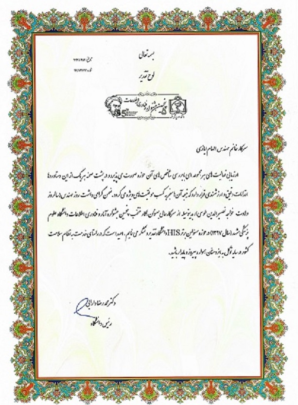 به مناسبت گرامیداشت روز مهندس (سالروز ولادت خواجه نصیر الدین طوسی) تقدیر از سرکار خانم الهام ایازی بعنوان همکار منتخب در حوزه مسئولین برتر HIS در پنجمین جشنواره فناوری اطلاعات دانشگاه سال 1397 |