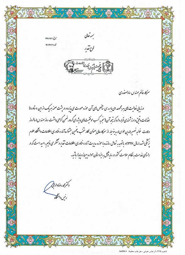 به مناسبت گرامیداشت روز مهندس (سالروز ولادت خواجه نصیر الدین طوسی) تقدیر از سرکار خانم سارا صفدری بعنوان همکار منتخب پنجمین جشنواره آمار و فناوری اطلاعات دانشگاه سال 1397 |