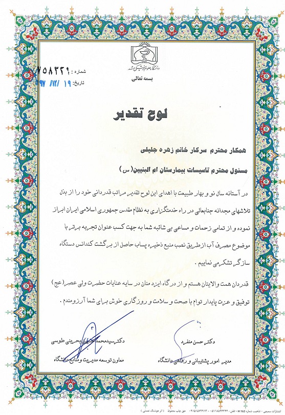 تقدیر از سرکار خانم مهندس زهره جلیلی مسئول محترم تاسیسات بیمارستان به جهت کسب عنوان تجربه برتر با موضوع صرفه جویی در مصرف آب از طریق نصب منبع ذخیره پساب حاصل از برگشت کندانس دستگاه سازگر |