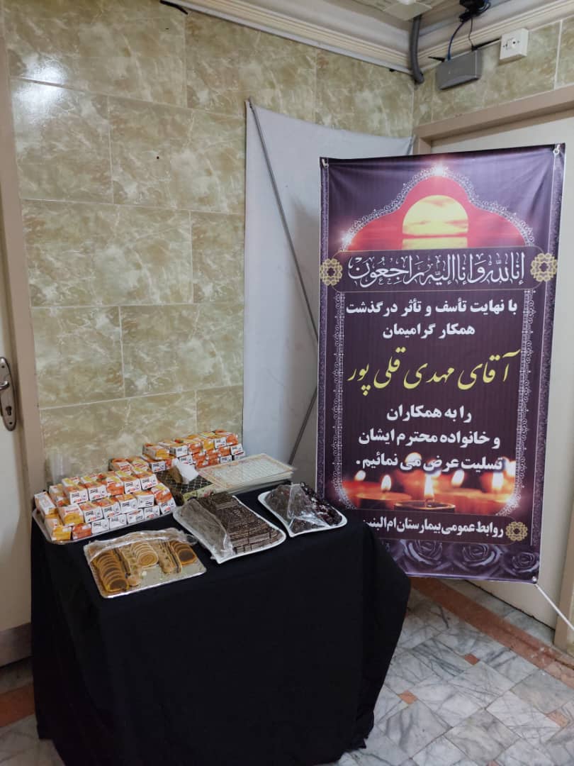 برگزاری مراسم یادبود زنده یاد مهدی قلی پور در بیمارستان این مراسم با حضور خانواده محترم آن مرحوم ،ریاست محترم، مدیریت، حراست و پرسنل بیمارستان و با مداحی آقای خدادادی و قرائت زیارت عاشورا برگزار گردید. در پایان مراسم ریاست محترم سرکار خانم دکتر اخلاقی از زحمات چندین ساله آن مرحوم در بیمارستان قدردانی نموده و یادشان را زنده نگاه داشتند. |